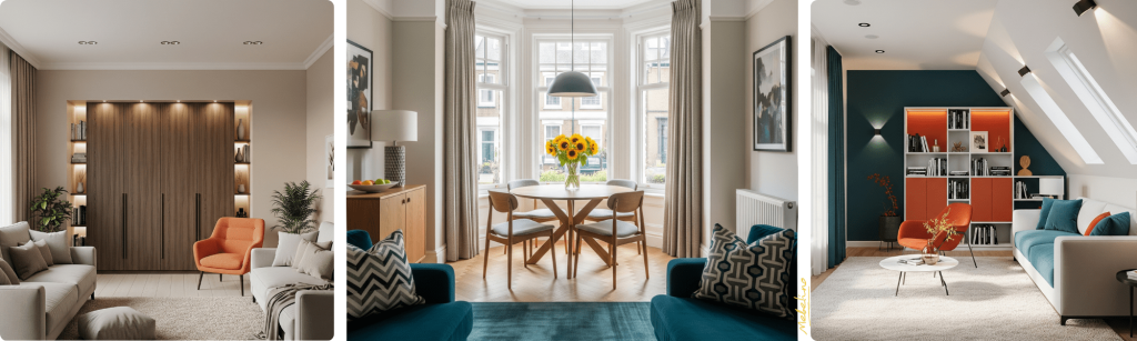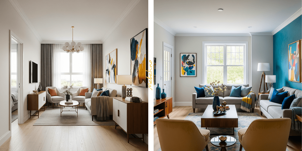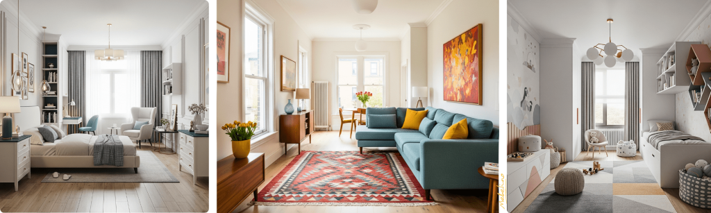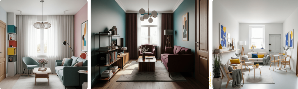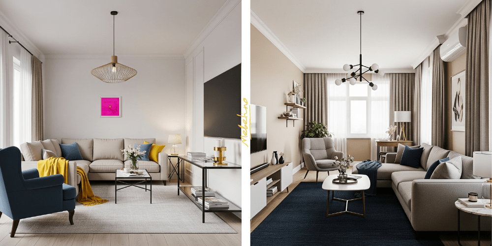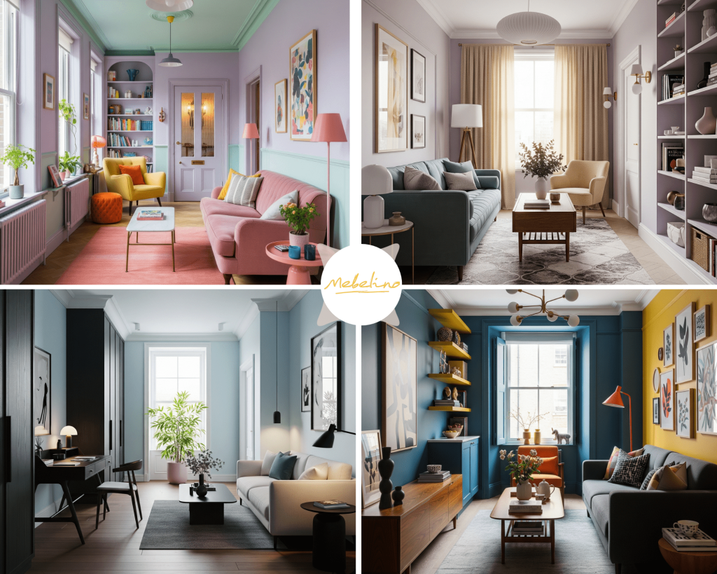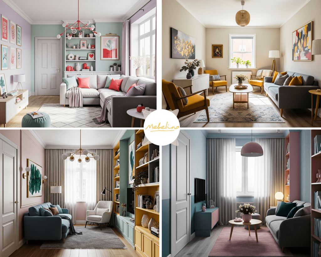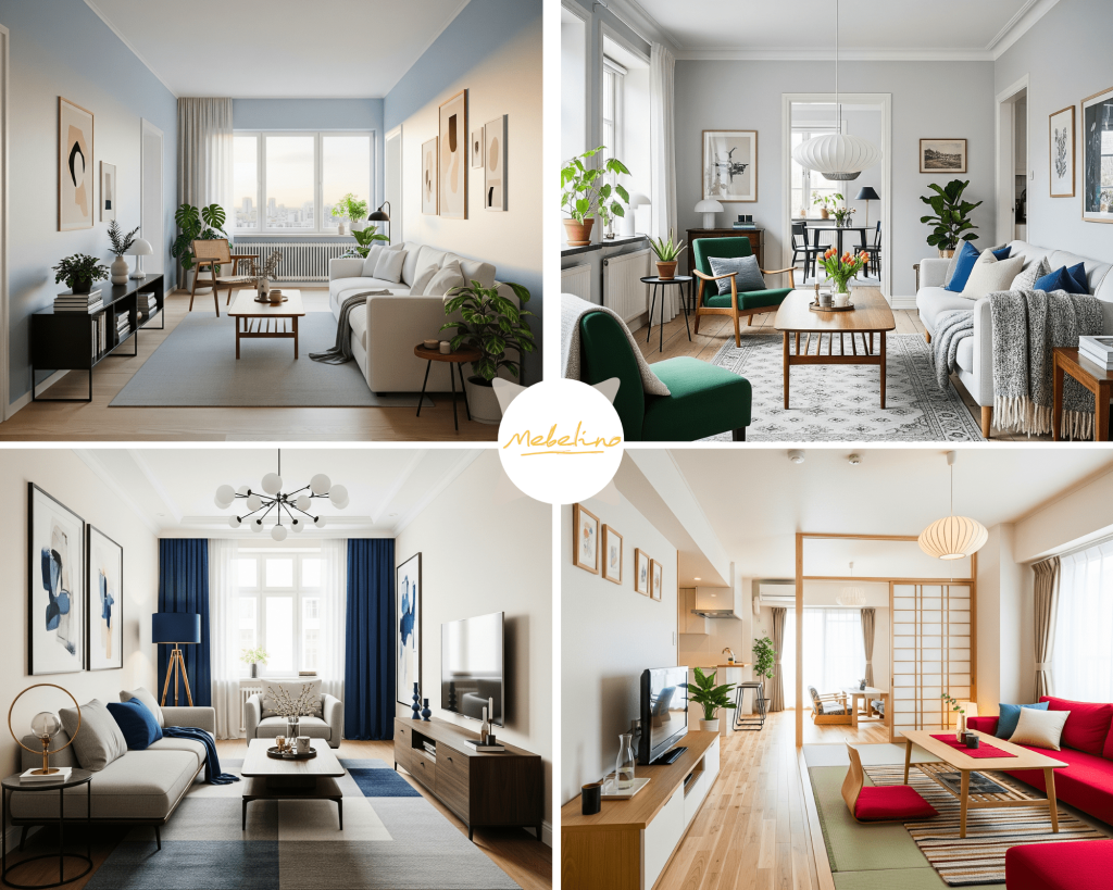 Красивая и практичная расстановка мебели в прямоугольных комнатах, выполненных в разных стилях