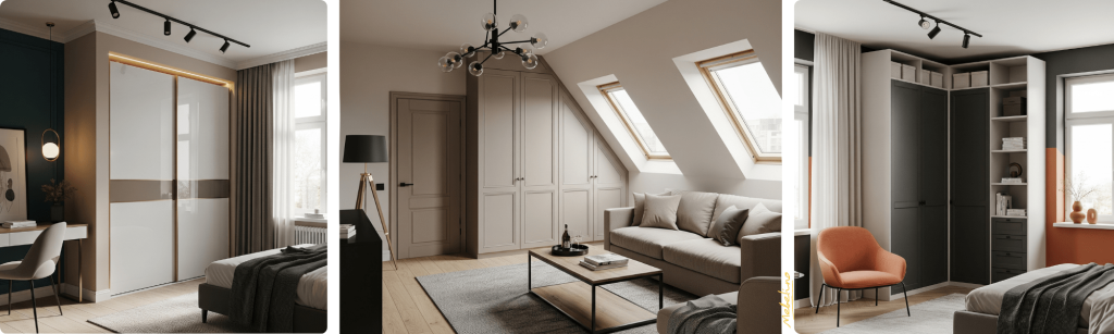 Позволяет – максимально использовать полезную площадь, в том числе пустующие углы, участки с наклонным потолком и всевозможные углубления.