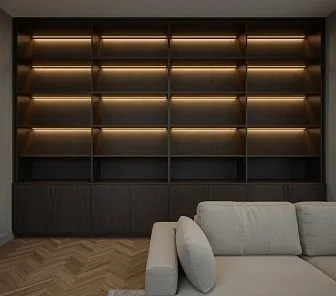 Встроенный тёмный стеллаж с равномерной подсветкой