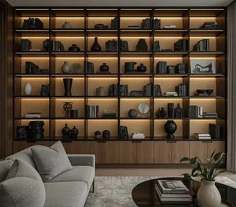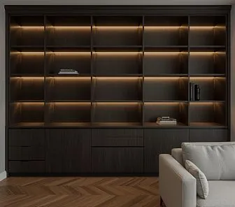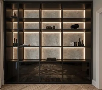 Темный книжный шкаф с ящиками и подсветкой