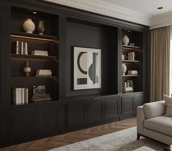 Встроенный книжный шкаф с декоративным карнизом и фасадами с фрезеровкой. Центральная ниша оформлена под зону ТВ или акцентную композицию. Открытые полки и нижние закрытые модули выполнены из МДФ в чёрной эмали, корпус — ЛДСП Egger. Идеальное решение для гостиных в классическом стиле. Изготавливается на заказ, возможна регулировка наполнения.