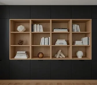 Строгий модульный книжный шкаф с корпусом из ЛДСП Egger в черной матовой отделке и центральными секциями из натурального шпона (каталог Woodstock). Нижние модули — с глухими дверцами, верхняя часть — открытые полки в деревянной отделке. Идеален для гостиных и кабинетов. Изготавливается по индивидуальному проекту. Фурнитура Blum или Hettich.