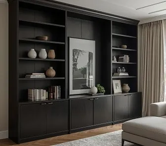 Черный книжный шкаф с нишей под ТВ или декор