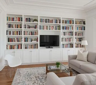 Белая встроенная библиотека с ТВ-зоной и нижними тумбами