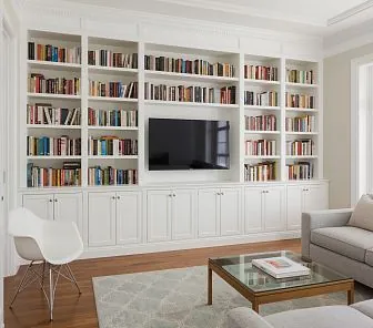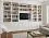 Встроенный белый книжный шкаф с ТВ-нишей во всю стену