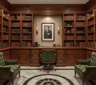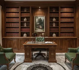 Роскошный кабинет с встроенными книжными шкафами, декоративным карнизом и полноценной рабочей зоной. Мебель выполнена из массива дуба или ясеня, фасады украшены инкрустацией и резьбой. Стол и тумбы интегрированы в единую композицию. Потайная подсветка, витрины со стеклом и латунная фурнитура подчёркивают премиальный уровень исполнения. Изготавливается на заказ под размеры помещения.