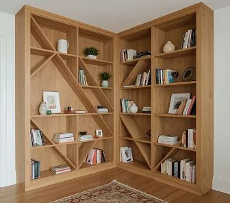 Угловой книжный шкаф из шпона дуба с диагональными секциями