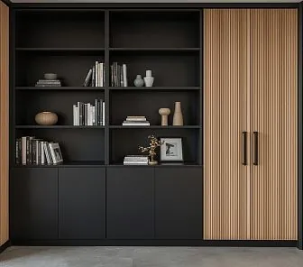 Модульный книжный шкаф в черном цвете с вставками под дерево