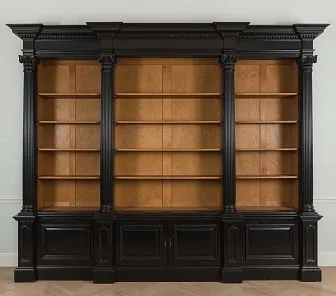 Роскошный книжный шкаф с открытыми полками и резными колоннами в классике. Внешняя отделка — черная эмаль, внутренняя часть — шпон дуба премиум-класса (каталог Woodstock). Нижние секции — с распашными фасадами и декоративными филёнками. Карниз с классическим профилем завершает композицию. Изготавливается под проект, в нужных размерах.