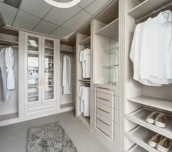 Что касается внутреннего наполнения, угловые гардеробные оборудуют: выдвижными ящиками, полками, обувницами, вешалками, штангами для вещей на плечиках, держателями для ремней и галстуков, брючницами, крючками и всевозможными органайзерами. Дополняют зеркалами, столиками, комодами и тумбами.
