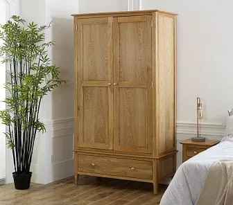 Маленький платяной шкаф с распашными дверями и наружным ящиком. Глянцевый лак сохраняет естественную красоту древесины. Такая мебель украсит интерьер помещения в стиле прованс. Внутренне наполнение платяного шкафа можно откорректировать для спальни, гардероба или прихожей при оформлении заказа.