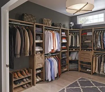 Модель из натурального дуба органично впишется в стилистику классических интерьеров. Эксклюзивный комплект разработан для гардеробных комнат с окнами, но также подойдет для жилых пространств с глухими стенами. Включает все необходимое для аккуратного хранения большого количества вещей – полки, секции, штанги для одежды, обувницы.