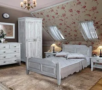 Практичный и удобный распашной шкаф для спальни в стиле прованс с красивым рисунком ясеня. Внутренне наполнение имеет штанги с вешалками для вещей разной длины и полки для хранения сложенного белья. Заказать набор можно в нестандартных размерах.