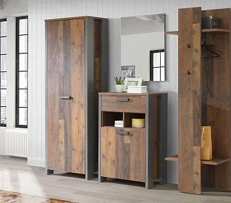Темная, глубокая текстура натурального дерева и оригинальный дизайн как нельзя лучше подойдут для лофтовых пространств. Включает в себя сквозную вешалку с антресолью, двухстворчатый шкаф с распашными фасадами для гардероба и вместительный комод с 2 нишами для аксессуаров. Мебель изготовлена из древесноволокнистой плиты, шпонированной натуральным деревом. Производится только по индивидуальным размерам.