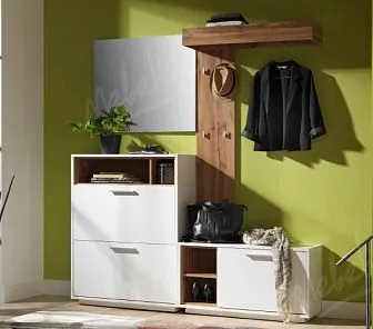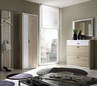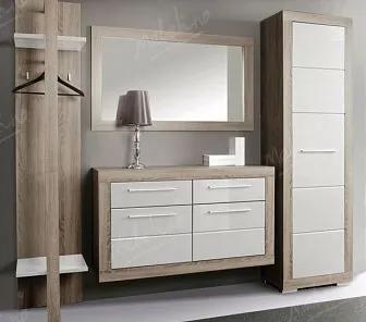 Набор мебели для просторной прихожей в белом окрасе. Центральное место занимает длинный комод для хранения обуви с мягким сиденьем. Вешалка прихожей имеет зеркало высотой 3/4 человеческого роста. Вместительный двустворчатый шкаф в узком корпусе и с карнизом имеет распашные двери и выдвижные ящики в классическом стиле. Высокий комод имеет две секции. Одна с открытыми полками, вторая с глухой дверью. Также имеются два выдвижных ящика. Корпус мебели изготовлен из древесноволокнистой плиты в шпоне, двери из массива дуба.