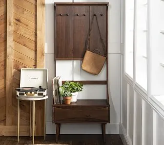 Модель прихожей из массива дерева с искусственно состаренными поверхностями помогает создавать красивые уютные интерьеры в классическом стиле. Подходит для маленькой прихожей.