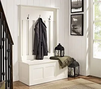 Белая прихожая в стиле лофт. Доступ в нижнюю зону для хранения вещей - через верхнюю распашную крышку. Материал корпуса – ламинированная древесностружечная плита "Egger", фасадов – древесноволокнистая плита средней плотности в матовой эмали.