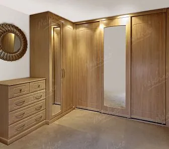 Угловая модель с комбинированными дверями шкафа (с раздвижной / распашной конструкцией). Оборудована подсветкой. Может дополняться антресолью, тумбами, комодами.