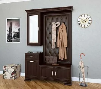 Изготовлена из массива дуба. Глубокий, насыщенный шоколадный оттенок приковывает внимание, становясь доминантой в любом интерьере. Набор мебели для прихожей включает систему хранения обуви, навесной шкафчик с зеркалом, тумбу с выдвижным ящиком и пространством для хранения. Стеновая вешалка со стеганым кожаным декором позволяет разместить 3 комплекта одежды. Производство – только под заказ.