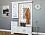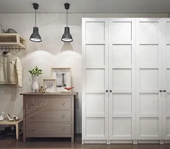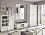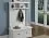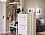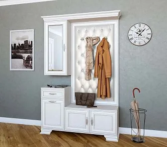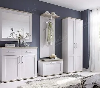 Набор мебели для просторной прихожей в белом окрасе. Центральное место занимает длинный комод для хранения обуви с мягким сиденьем. Вешалка прихожей имеет зеркало высотой 3/4 человеческого роста. Вместительный двустворчатый шкаф в узком корпусе и с карнизом имеет распашные двери и выдвижные ящики в классическом стиле. Высокий комод имеет две секции. Одна с открытыми полками, вторая с глухой дверью. Также имеются два выдвижных ящика. Корпус мебели изготовлен из древесноволокнистой плиты в шпоне, двери из массива дуба.