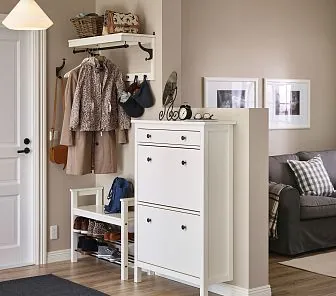 Минимализм в прихожей может быть вместительным. Подвесная вешалка с открытой полкой и открытой штангой. В открытую приставную обувницу поместится 6-8 пар обуви. Ее верх - одновременно и сиденье и полка для сумок. Дополняет комплект узкий комод, который тоже подвесной и одновременно с ножками. Материал мебели МДФ в эмали.