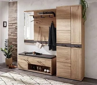 Все необходимое для практичной и стильной меблировки прихожей. В одном гарнитуре - двустворчатый шкаф, комод с выдвижными ящиками, обувница с мягкой зоной, навесная вешалка и зеркало. Использованы комбинированные материалы: корпус из ламинированной ДСП «Egger» и массива натурального дерева. Фасады – премиальный МДФ, покрытый эмалью. Предварительный замер параметров помещения перед заказом обязателен.