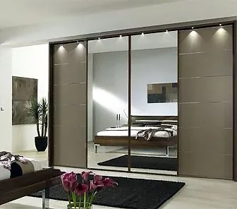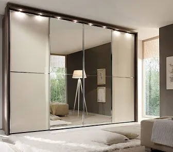 Мебель с четырьмя створками, в светлых тонах, дополненная зеркалами, что визуально расширяют пространство
