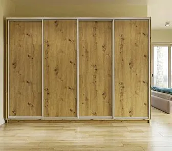 Практичный шкаф-купе, очаровывающий природной красотой натуральной древесины. Створки выполнены из ламинированной ДСП с ламинированной фотопечатью, воссоздающей во всем подробностях текстуру природного материала. Внутреннее наполнение шкафа включает зону для хранения гардероба, ниши и выдвижные ящики для белья, корзины и галстучницы. Надежная система купе – безупречное качество от «Blum». Шкаф изготавливается только на заказ.