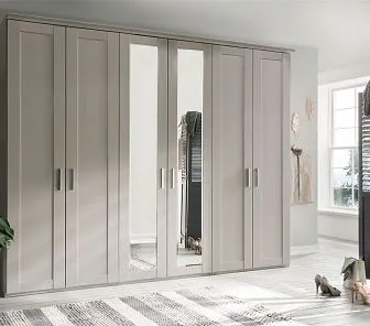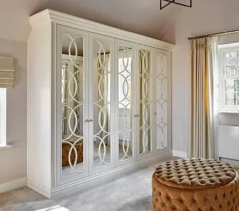 Модульный гардеробный шкаф, включающий 2 центральных фасада-зеркала. Филёнчатые фасады выполнены из МДФ с эмалированным покрытием. Продуманное наполнение включает помимо стандартных зон для хранения одежды брючницу, галстучницу, ящики и белевую корзину. Используется фурнитура “Хеттих”, зеркала с серебряным напылением. Производство – в различных размерах, под заказ. Потребуется выезд нашего сотрудника для снятия размеров.
