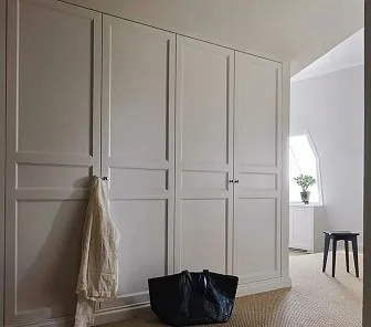 Встраиваемая в нишу система хранения с 3 секциями для одежды и отдельно - нижними для обуви. Впечатляющие рельефные фасады выполнены из МДФ в матовой эмали. Элегантный дизайн идеально подходит для классических, утонченных интерьеров. Фурнитура в классическом стиле - от Blum. Изготовление - по размерам ниши для установки.