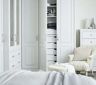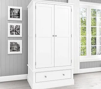 Белая мебель в стиле прованс. Распашной шкаф может быть укомплектован различными системами хранения: закрытые глухими дверями отделы, выдвижные ящики. Внутренне наполнение шкафа может быть для спальни, прихожей или платяного шкафа.
