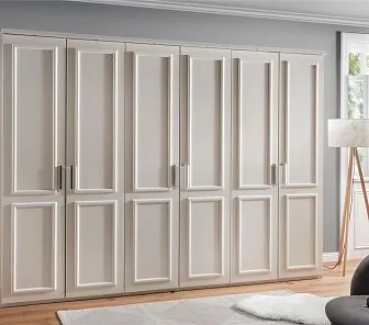 Пятистворчатый шкаф с филёнчатыми дверьми с классическим наполнением - полки и штанги для одежды, выдвижные ящики. По вашему желанию в функциональность можно внести изменения - например, установить прозрачную витрину для посуды или декора, книжные полки или добавить зеркало на фасад и встроенную обувницу для варианта в прихожую. Корпус - премиум ЛДСП из Австрии. Комплектуется фурнитурой “Блюм”. Изготавливается исключительно под заказ и только в индивидуальных размерах.