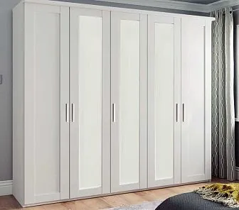 Большой прямой пятистворчатый шкаф в белом цвете. Корпус шкафа из ЛДСП "Egger". Двери из МДФ в матовой эмали. Зеркала встроены снаружи и покрытием серебра. Покупатель получит мебель по нужным ему размерам и по цене изготовителя.