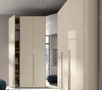 Элегантный радиусный шкаф в мягком бежевом оттенке с классическими филёнчатыми фасадами станет гармоничным дополнением любого интерьера. Изогнутая форма позволяет эффективно использовать угловое пространство, а изысканные латунные ручки подчёркивают утончённость дизайна. Шкаф отличается вместительностью и продуманной внутренней организацией, что делает его идеальным для хранения одежды, белья и аксессуаров.