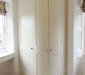 Радиусный угловой шкаф в цвете слоновой кости с филёнчатыми фасадами