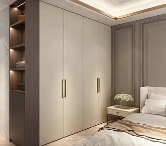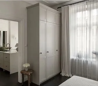 Элегантный встроенный шкаф с четырьмя распашными дверями в классическом оформлении, гармонично интегрированный в нишу спальни. Светло-серый фасад с глубокими филёнками подчёркивает утончённость и спокойствие интерьера. Рамочная фрезеровка создаёт рельеф и визуальную глубину, а лаконичные ручки добавляют современности. Шкаф идеально подойдёт для спальной зоны или гардеробной, выполненной в стиле неоклассика, скандинавский классик или soft minimalism.