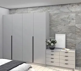 Впечатляющий встроенный шкаф с четырьмя распашными фасадами и оригинальным 3D-узором. Эффектная геометрическая фрезеровка создаёт игру теней и глубины, делая этот предмет мебели акцентным элементом интерьера. Цвет — серо-графитовый, благородный и универсальный. Идеально подойдёт для современного или минималистичного пространства, где важна эстетика и строгость линий. Материал фасадов — МДФ с глубокой фрезеровкой, покрытие — матовая эмаль. Ручки — накладные, лаконичные, металлические в тёплом сером оттенке.