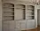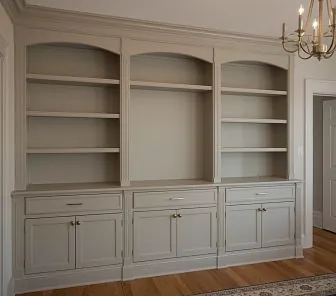 Трёхсекционный встроенный шкаф с арочными верхами и вертикальными каннелюрами. Верхняя часть — открытые полки, нижняя — тумбы с фасадами МДФ и столешницей под шпон дуба. Эмаль — в спокойном серо-бежевом оттенке (любые цвета RAL/NCS). Изготавливается по индивидуальным размерам, фурнитура — Blum, Hettich, HAFELE.