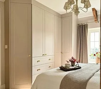 Изящный угловой шкаф бежевого цвета в спальню G239