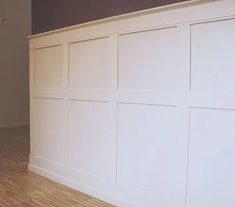 Вариант для тех, кто хочет легко и быстро оформить помещение в классическом стиле. Реечная панель размерами 2,5 на 2,5 м позволит провести отделку в кратчайшие сроки. Изготовлена из влагостойкого ЛДСП, подходит для монтажа в санузлах и на кухнях. Производство под заказ.