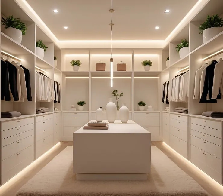 Современная гардеробная в белом матовом исполнении с островом по центру и симметричной системой хранения. Минималистичный дизайн дополнен точечной подсветкой и мягким светом в нишах. Продуманное наполнение включает ящики, открытые полки и штанги на разных уровнях. Идеальное решение для светлого и просторного интерьера. Производится по индивидуальному заказу.