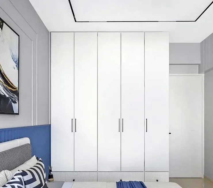 Узкие и однотонные распашные створки позволяют поставить шкаф в коридоре или сделать перегородкой для разделения комнаты. Материал корпуса ЛДСП "Egger", дверей МДФ в эмали. Используется фурнитура Hettich или Blum. Изготавливается по размерам стены.