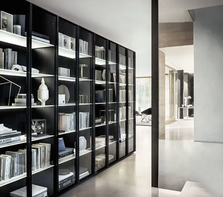 Длинный шкаф со стеклянным фасадом в современном стиле. На полках можно не только хранить книги, но и демонстрировать предметы декора. Чёрный корпус создаёт фон, белые полки подчёркивают ячейки. Мебель изготавливается по размерам помещения. Материал от бюджетного до престижного: ЛДСП "Egger", МДФ в матовой эмали, МДФ в шпоне, массив бука, дуба, ясеня.