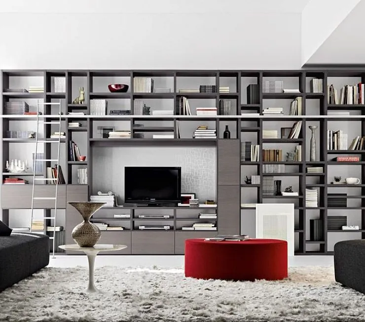 Большой стеллаж для книг, дополненный несколькими закрытыми отсеками и местом для размещения телевизора
