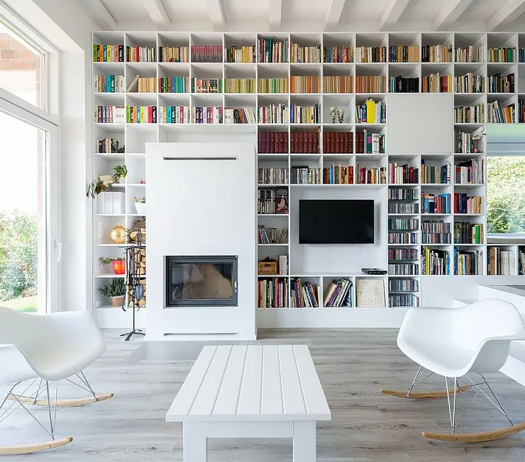 Неординарный проект, создающий не только место для хранения книг, но также размещения камина и телевизора
