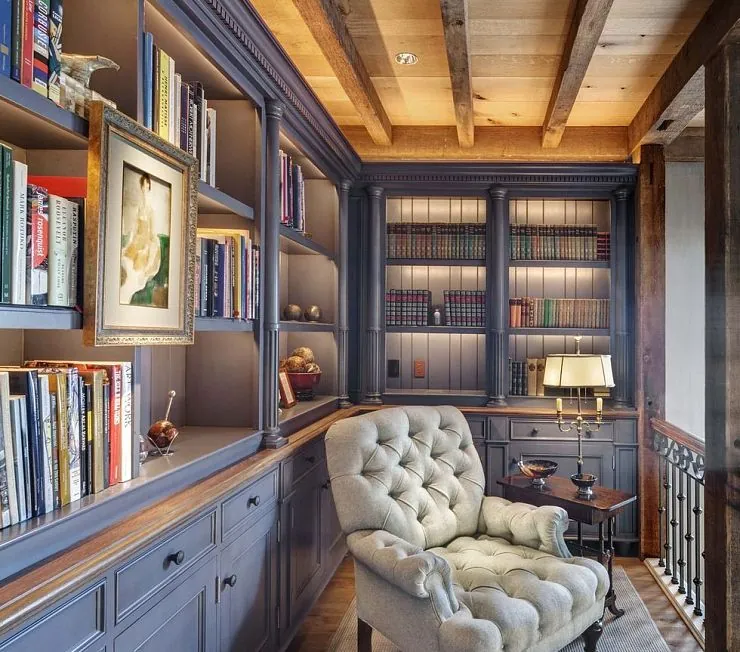 Основу библиотеки составляет угловой шкаф из массива дерева с изысканной резьбой. В шкафу имеются с открытые полки для книг, ящики для бумаг и закрытые распашными створками отсеки. Деревянные фасады покрыты элитной эмалью, которую можно сочетать с патинированием, что добавляет мебели эксклюзивности.