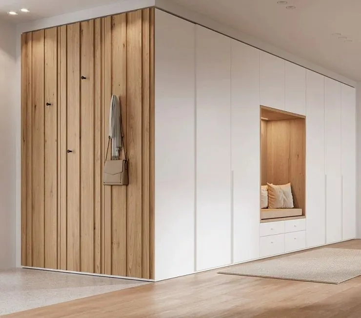 Встроенная мебель прихожей в белом оттенке выделяется лаконичным исполнением без дверей, практичностью использования и хорошей вместительностью. Окончательная цена мебели зависит от породы дерева. Собственное производство. На выбор в прямом и угловом исполнении.