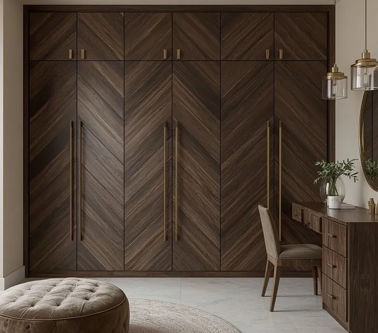 Эффектный шкаф от пола до потолка с фасадами из тёмного шпона, уложенного в изысканный рисунок “ёлочка”. Продуманный до мелочей дизайн в сочетании с высокими латунными ручками и верхними антресолями создаёт ощущение дорогого и респектабельного интерьера. Идеальное решение для спален, гардеробных и кабинетов в стиле неоклассика, ар-деко или современный люкс.