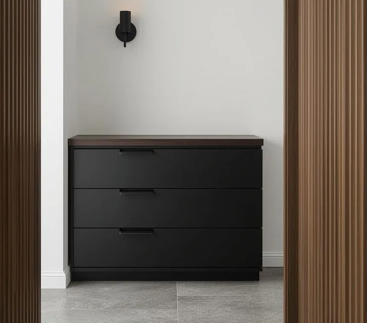 Современный шкаф для хранения обуви в насыщенном чёрном цвете с тремя вместительными ящиками. Контрастная древесная столешница добавляет тепла и стиля, а лаконичные ручки подчёркивают минимализм дизайна. Идеально впишется в прихожую в стиле модерн, лофт или минимализм.