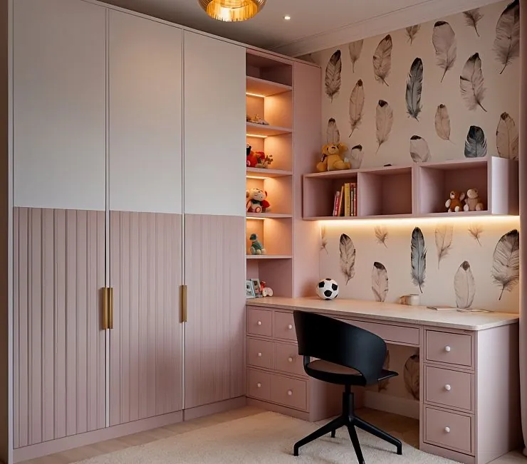 Яркий и уютный встроенный комплект для детской комнаты в нежно-розовой гамме. Сочетает вместительный шкаф с декоративными вертикальными панелями, рабочую зону с удобным столом и множеством выдвижных ящиков, а также открытые полки для книг и игрушек. Подсветка делает интерьер тёплым и атмосферным, а акцентная стена с рисунком перьев добавляет лёгкости и уюта.
